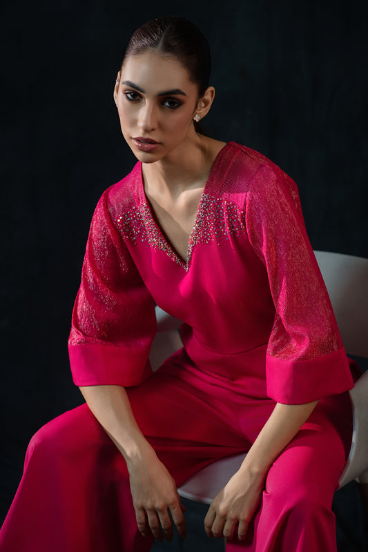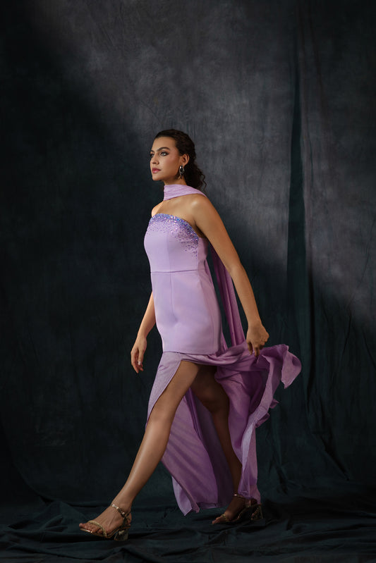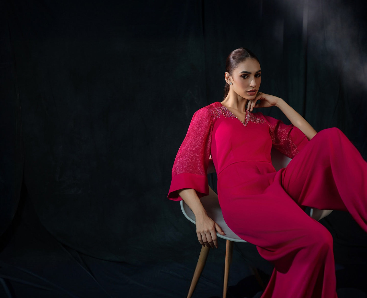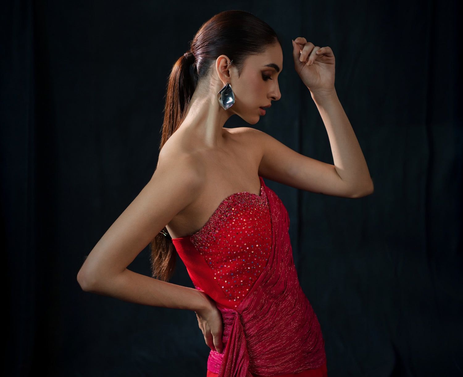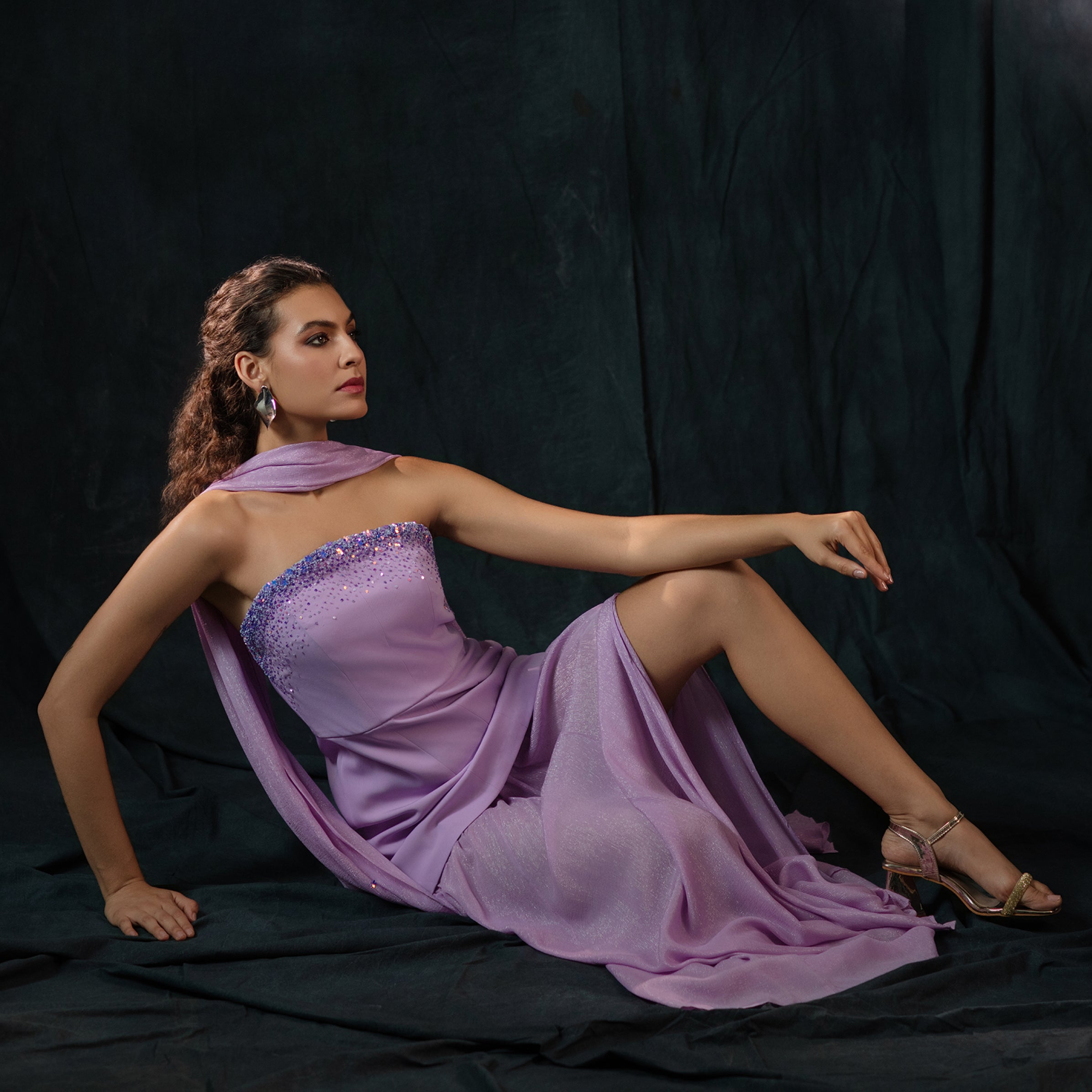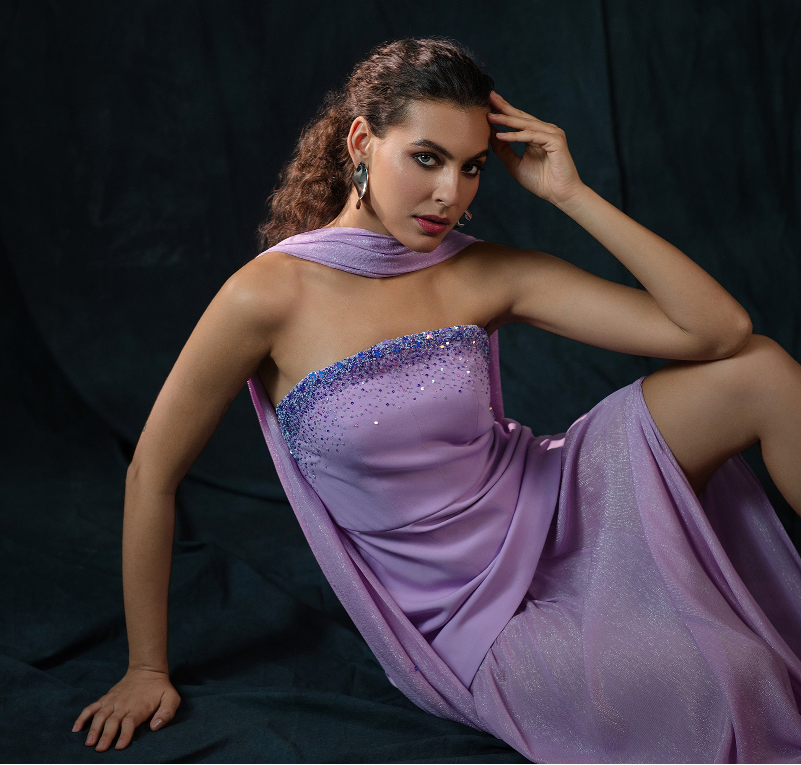 The elegance of luxe crepe meets the artistry of hand embellishment — graceful, luminous, and enduring.