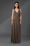 With sultry allure, this Istanbul metallic mist dress features a daring slit and V neckline. The neckline has a detailing of cubic green-gold hue sequins, sewn all along the front and back of the neck highlighting the collar bone and deep V neckline.
