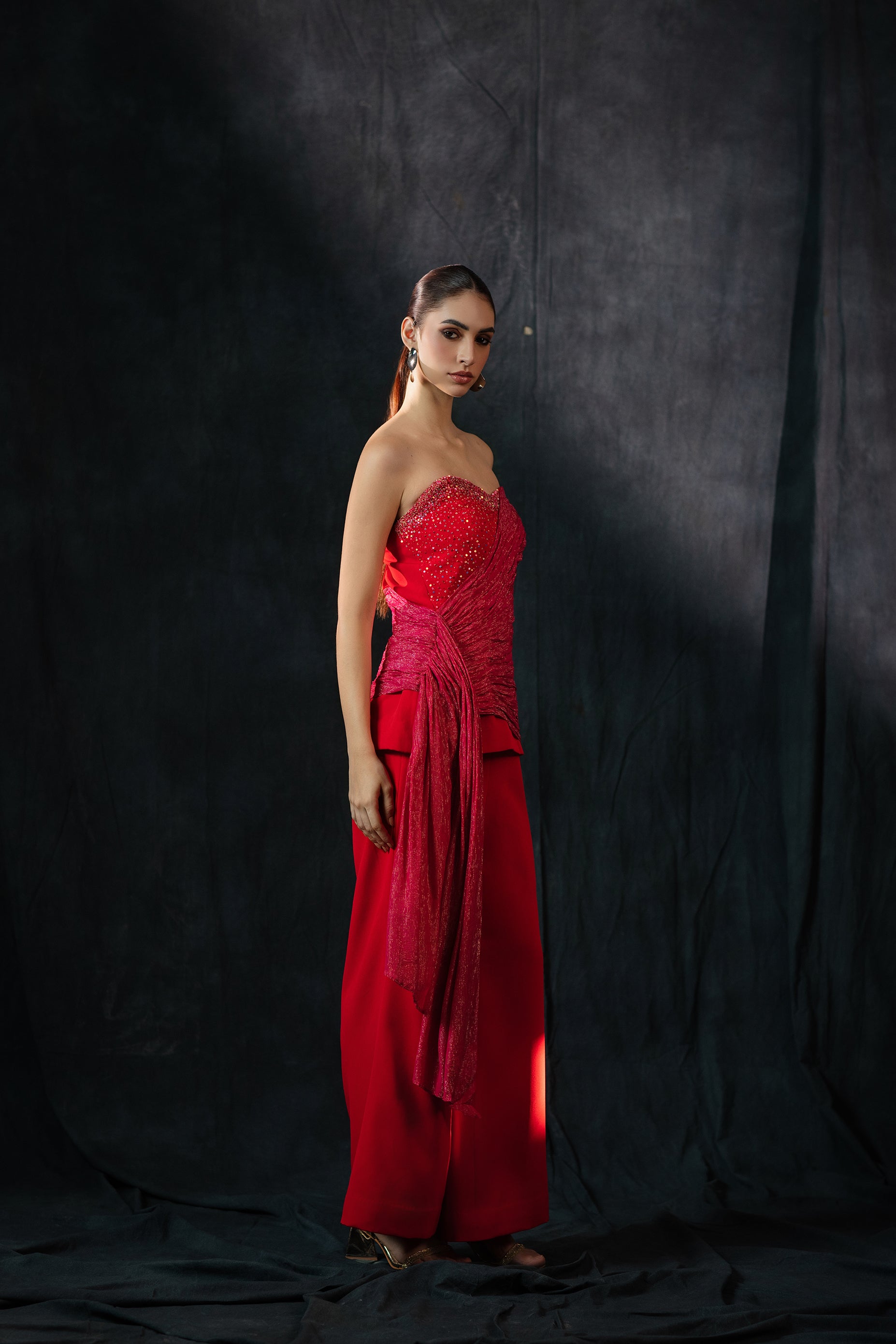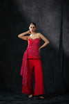 A strapless sculpted top designed in textured metallic mesh, hand–draped to create a fluid, sculpture–like form. The bodice is hand–embellished with individually placed sequins and cut pipes, following the natural direction of the drape for a liquid–light effect. Built with secure internal corsetry, it offers structure, stability and comfort while maintaining a high–fashion, art–inspired silhouette.