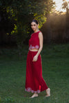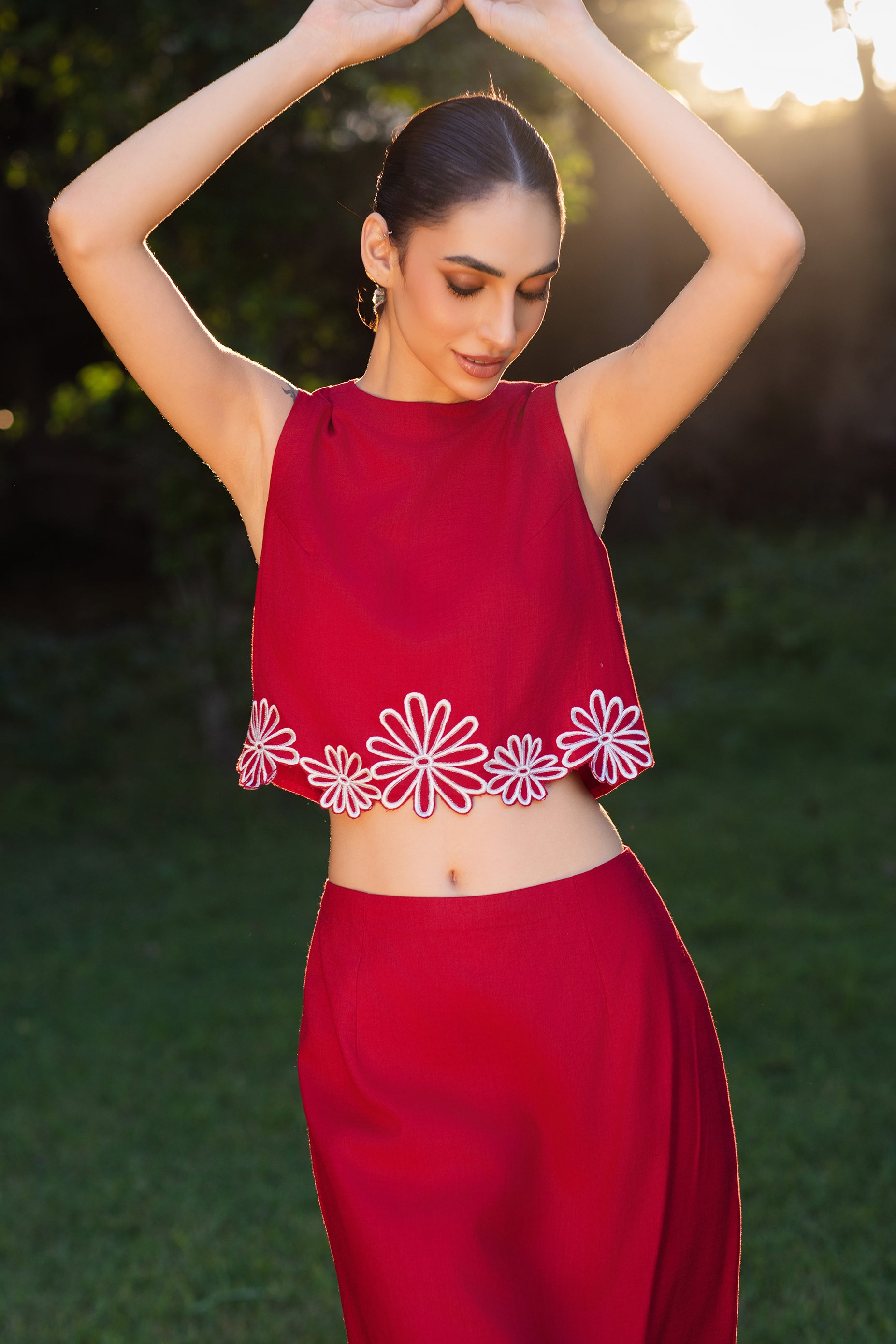 A sleeveless cropped top crafted in 100% breathable linen, designed for effortless summer elegance. The silhouette is minimal and relaxed, enhanced with tonal hand embroidery along the hem, adding an artisanal finish while keeping the look refined and understated. The soft blush red sky tone gives it a warm resort glow, making this a perfect choice for everyday out.
