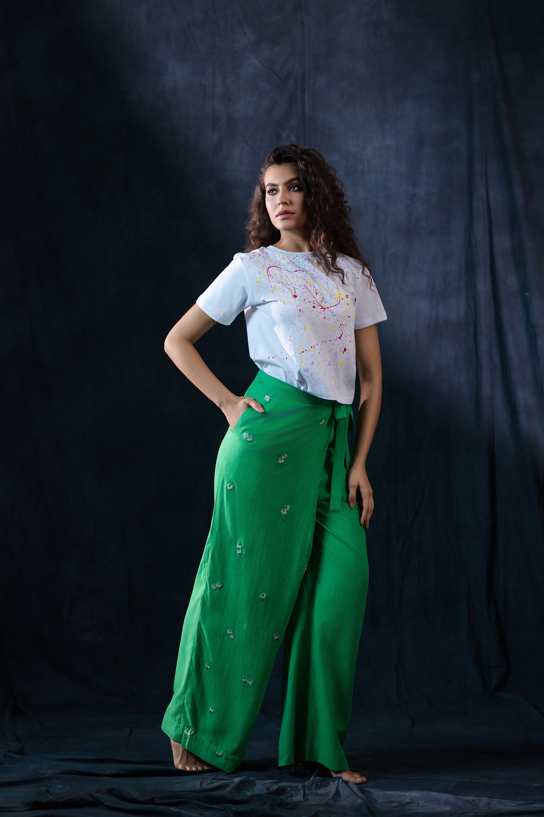 A wearable canvas of contemporary art — this pure white tee features hand-painted splatter detailing in vibrant tones, making every piece truly one-of-a-kind. The relaxed silhouette and soft, breathable fabric offer effortless comfort, while the abstract paint strokes bring a playful yet elevated touch.
