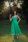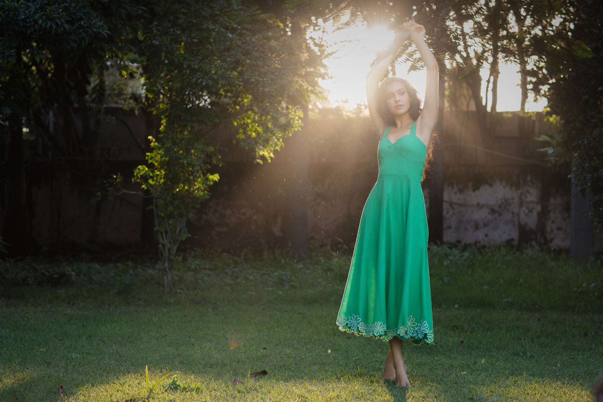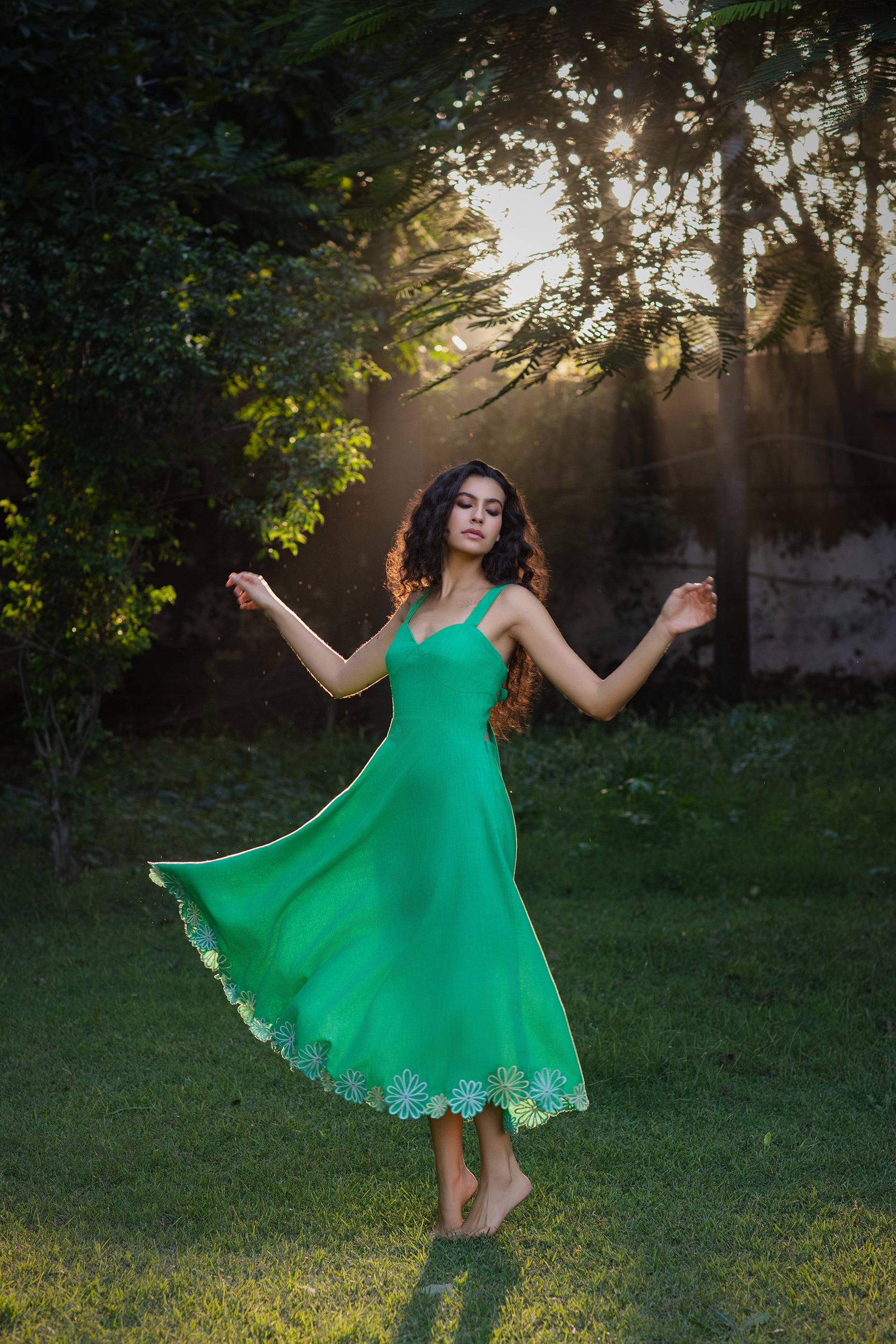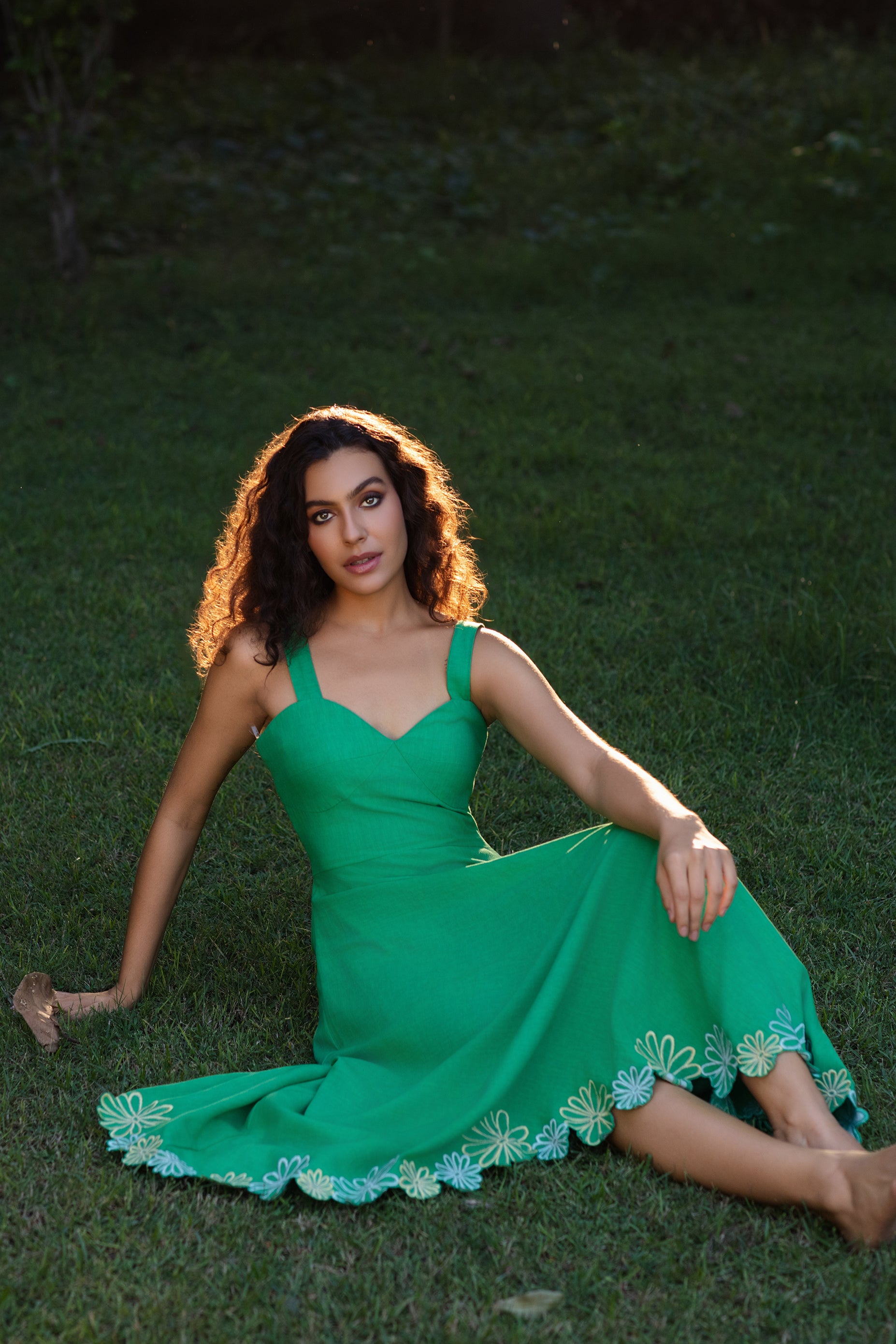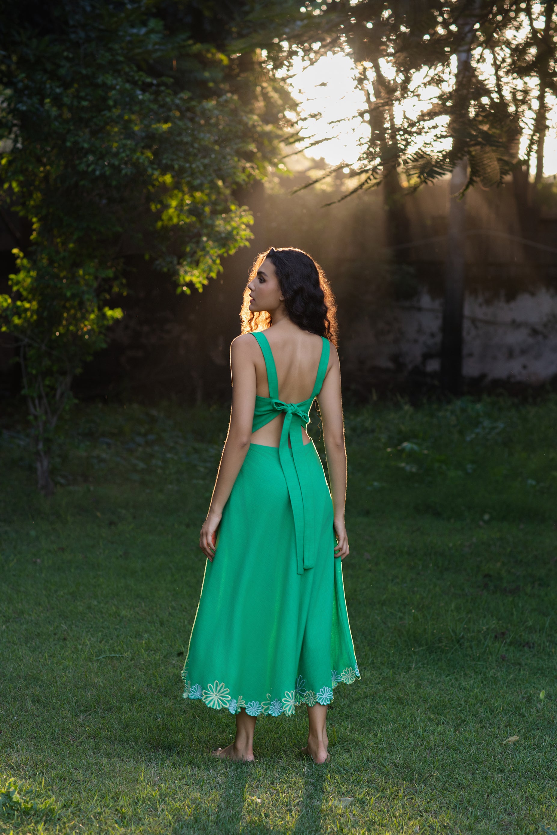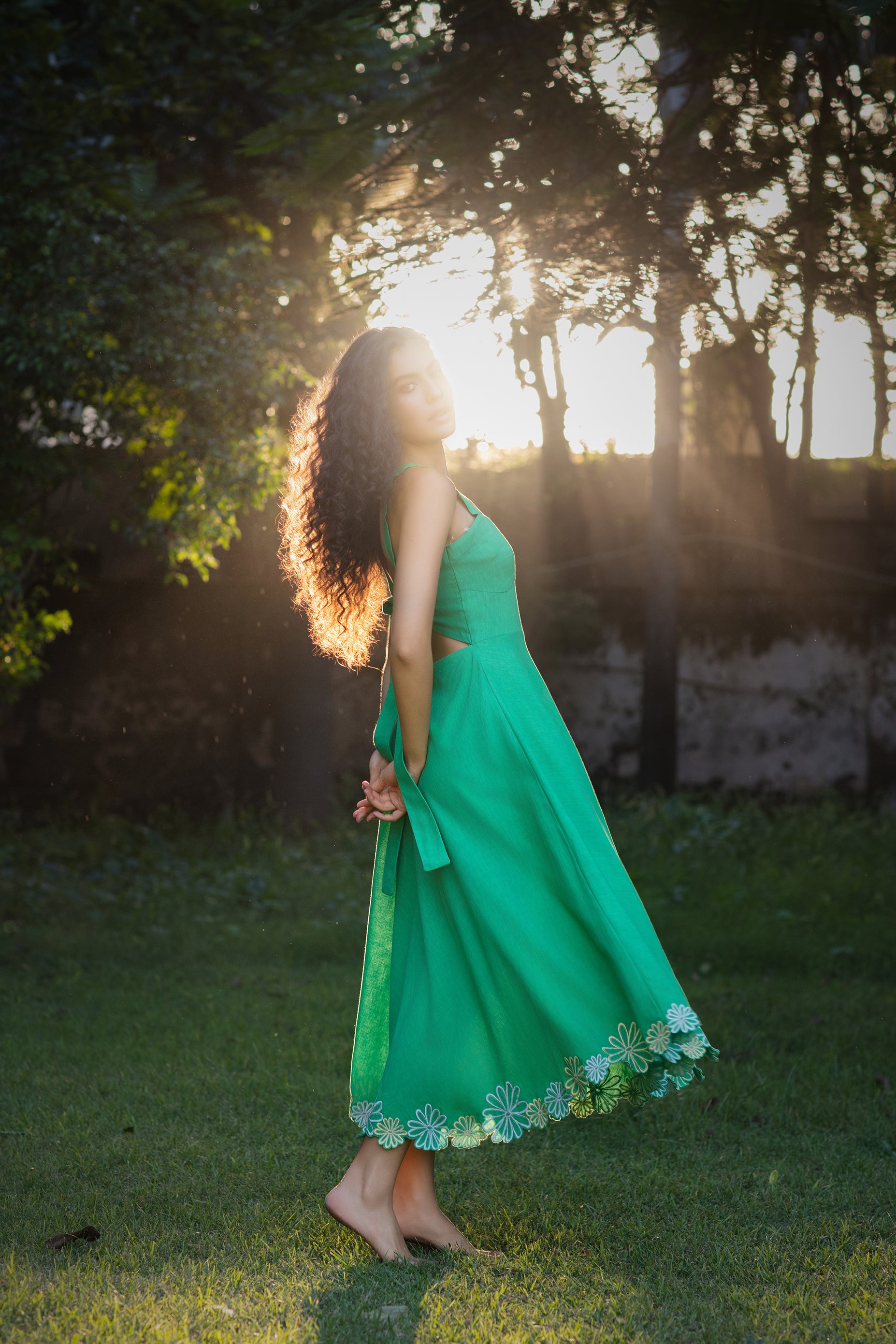 The dress falls into a soft A-line silhouette, engineered to move with ease while maintaining a refined shape. Along the hem, delicate daisy-inspired hand embellishment adds an elegant handcrafted finish — fresh, subtle, and globally relevant.