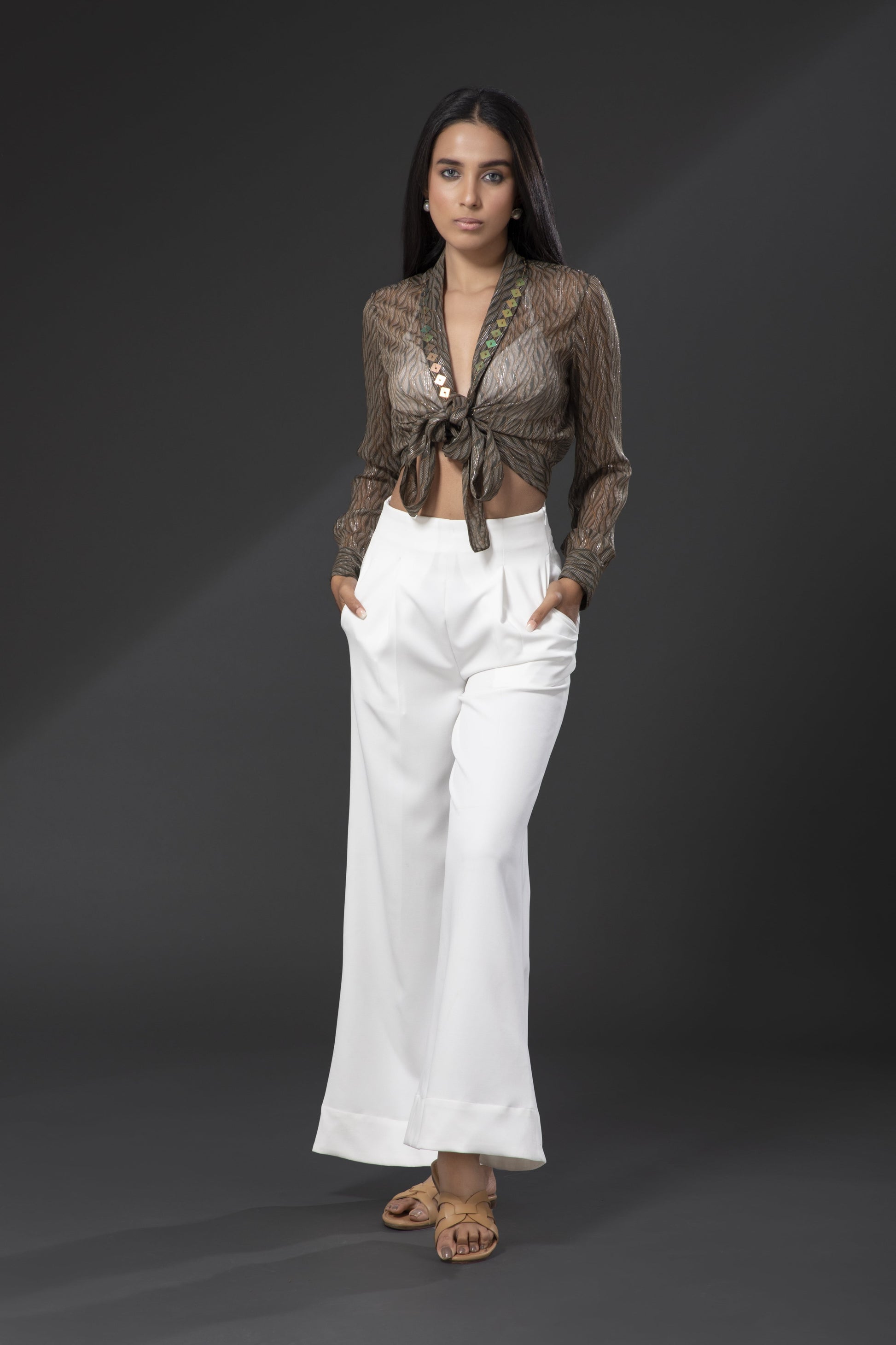 A chic Metallic mist print blouse should form the foundation of your closet edit. It is crafted from the luxurious sheer silk chiffon with gold-green hue cubic sequins on it. The blouse is cut for a wrap resort silhouette, with a front tie up. There are endless ways to style this blouse, wrap it on or tie it up to give a crop top look. The sheer fabric makes this outfit a perfect holiday ensemble choice. The Metallic Mist print is the signature limited edition print of Zeefaa. Pair it with flared pants to make a style statement.