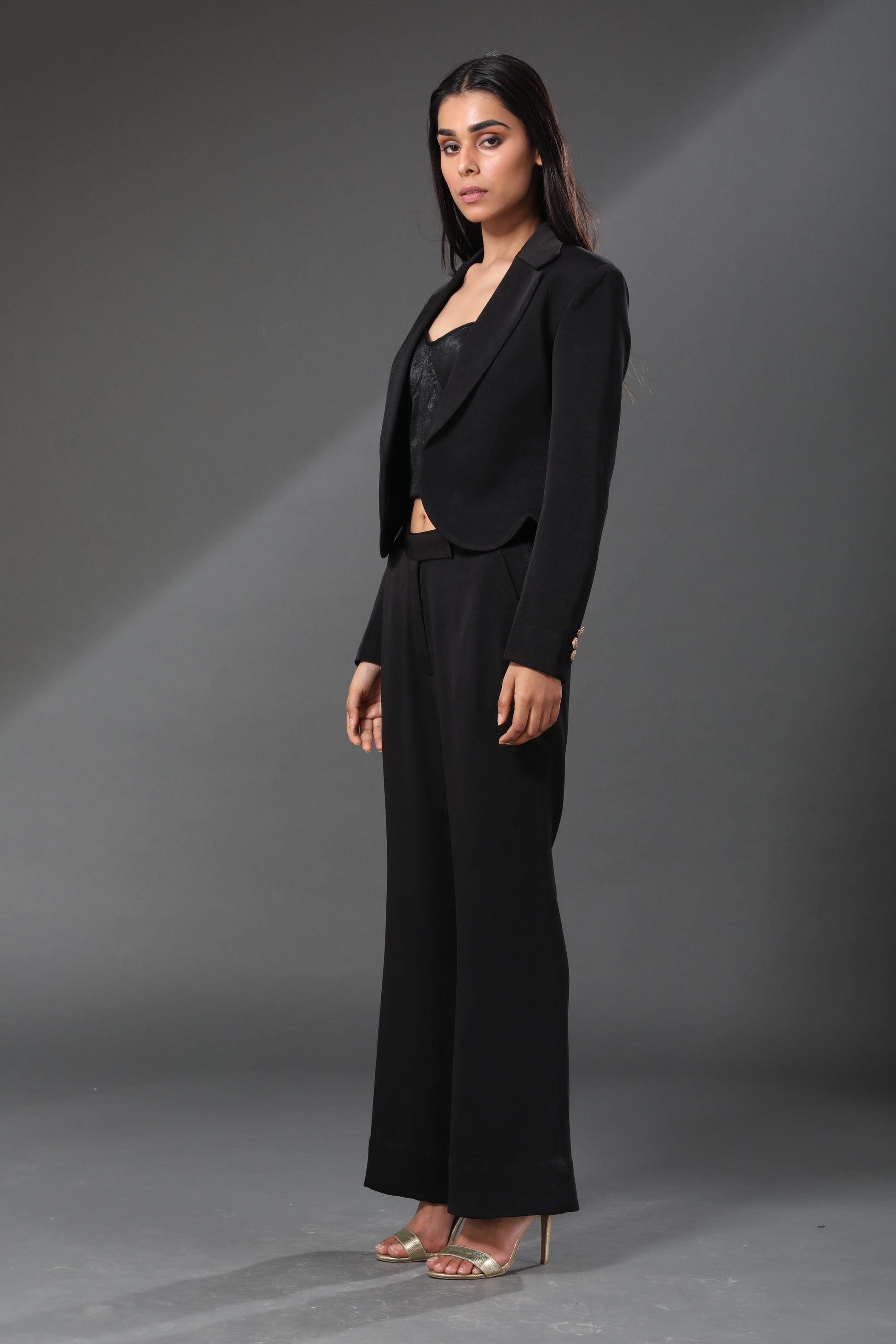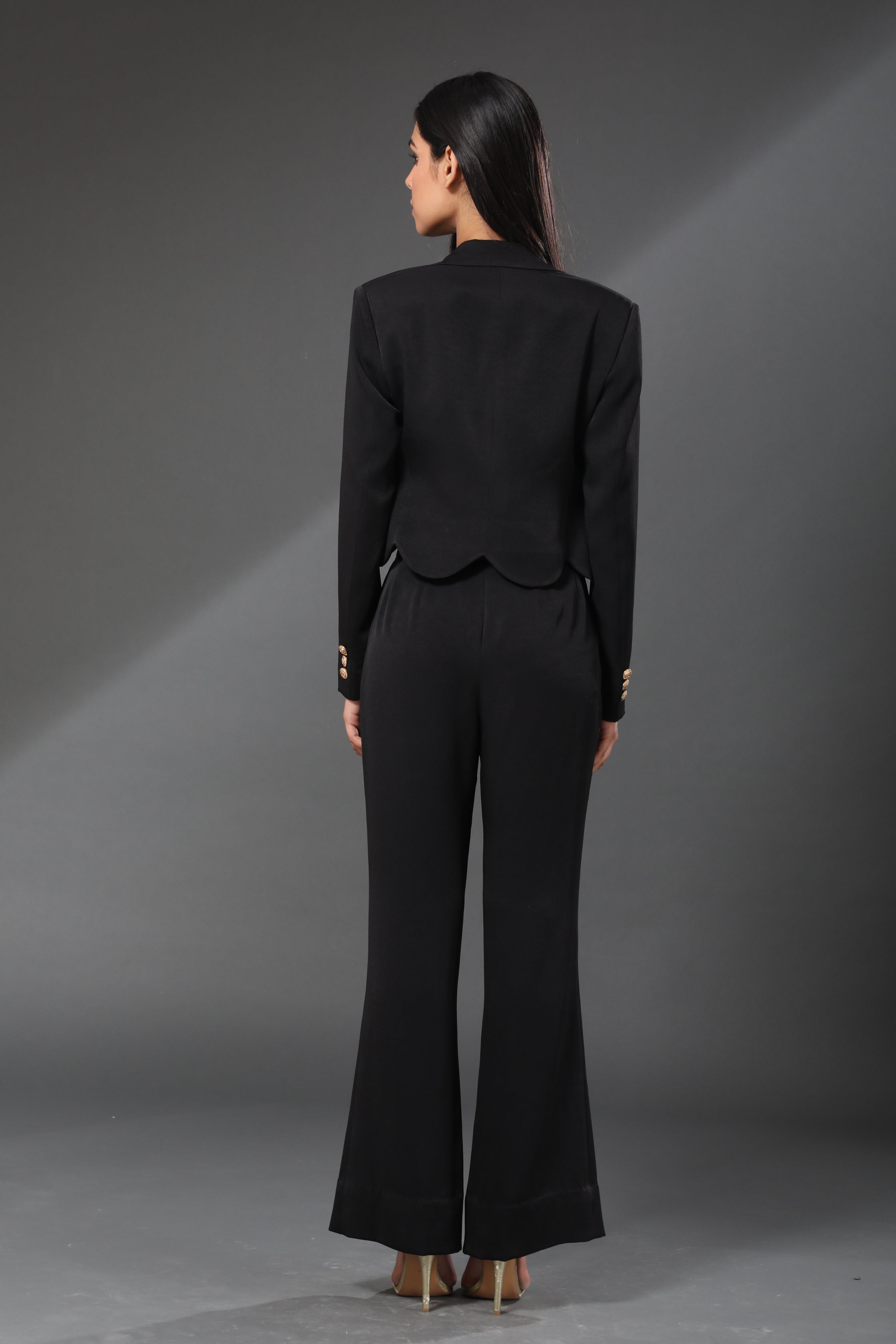 How can one go wrong with crepe black flared trouser. An utilitarian trouser that would pair well any shirt or top. It is an investment piece that would elavate the look of all ensembles and will last for years.
