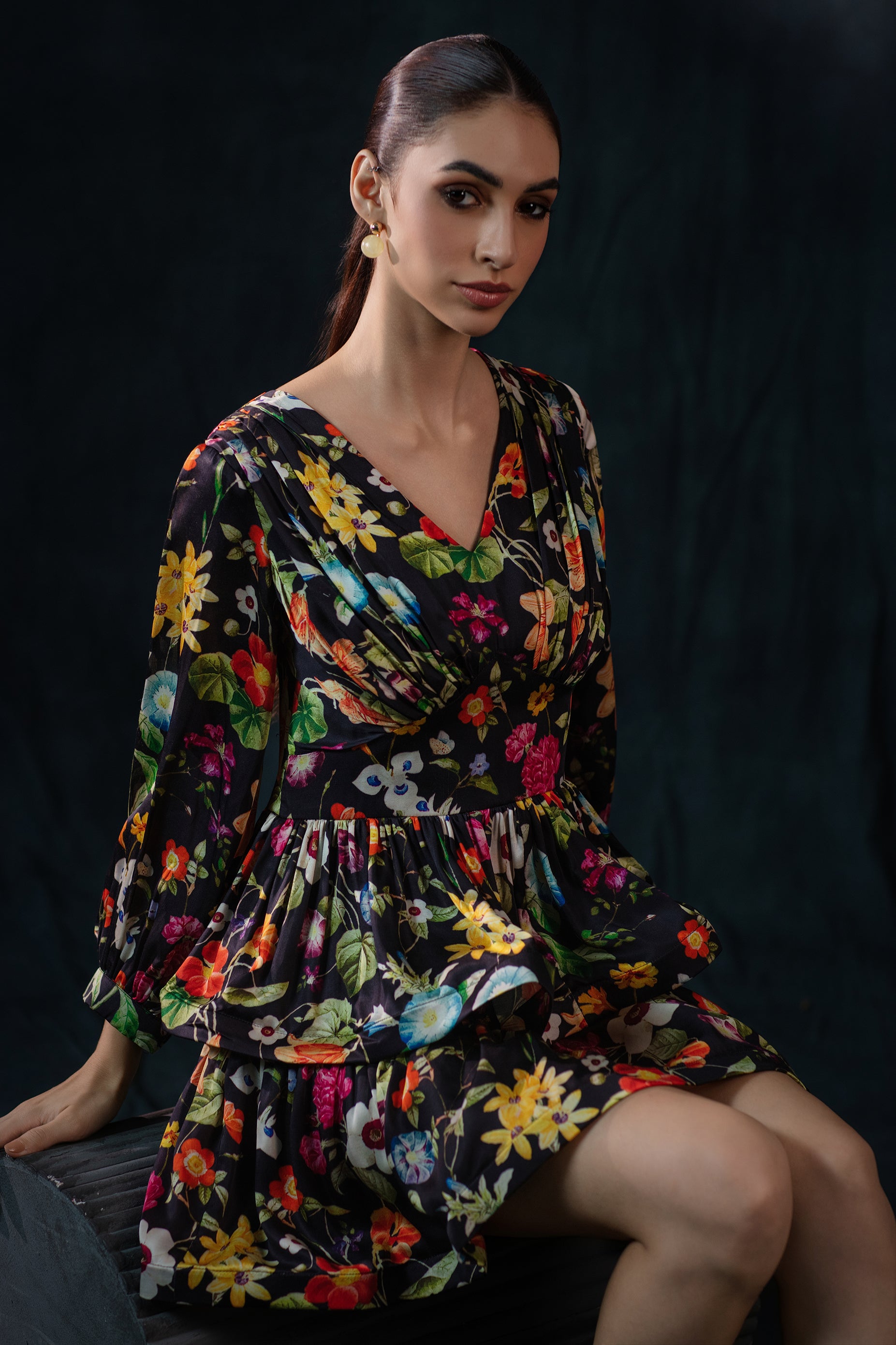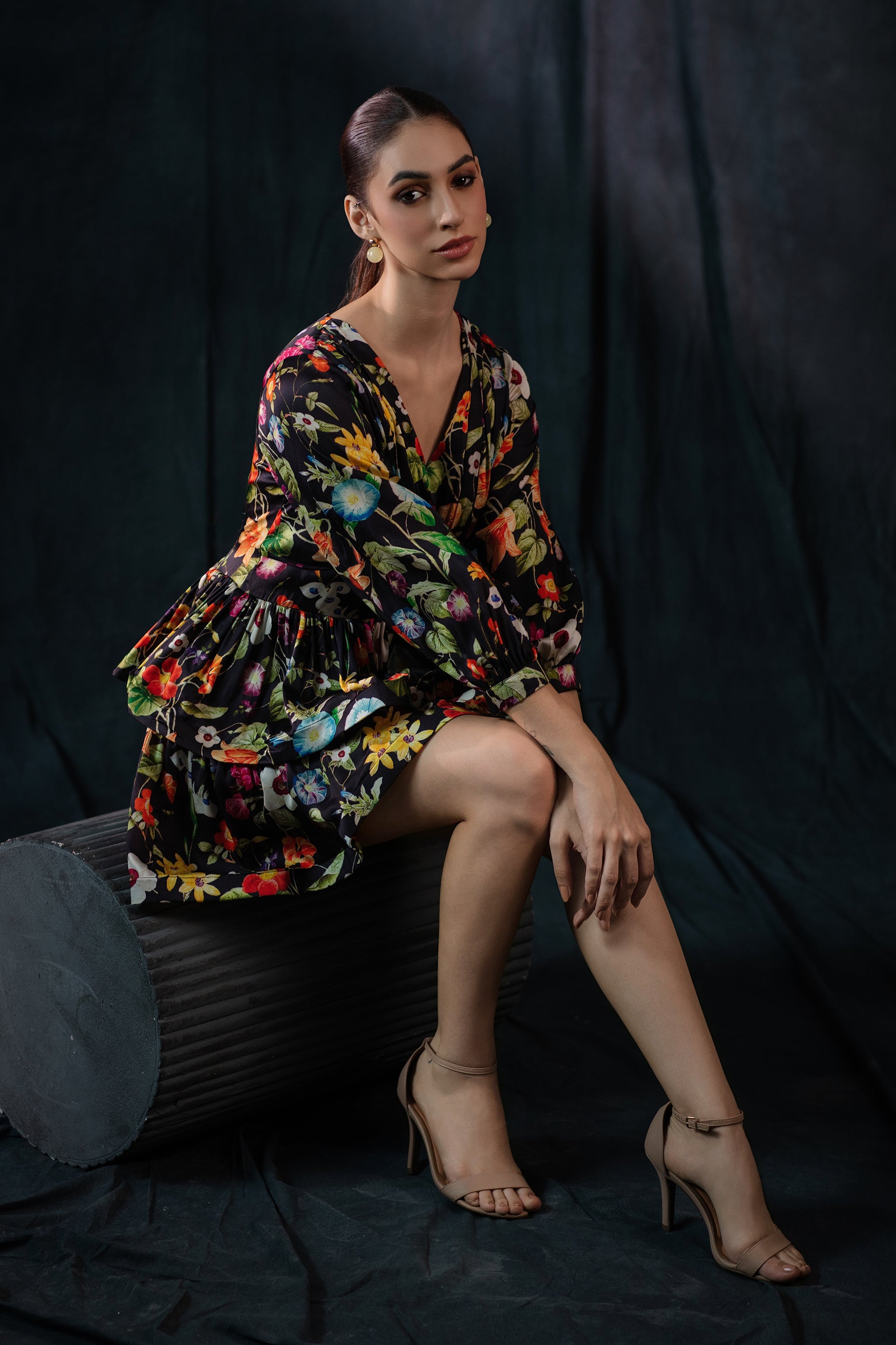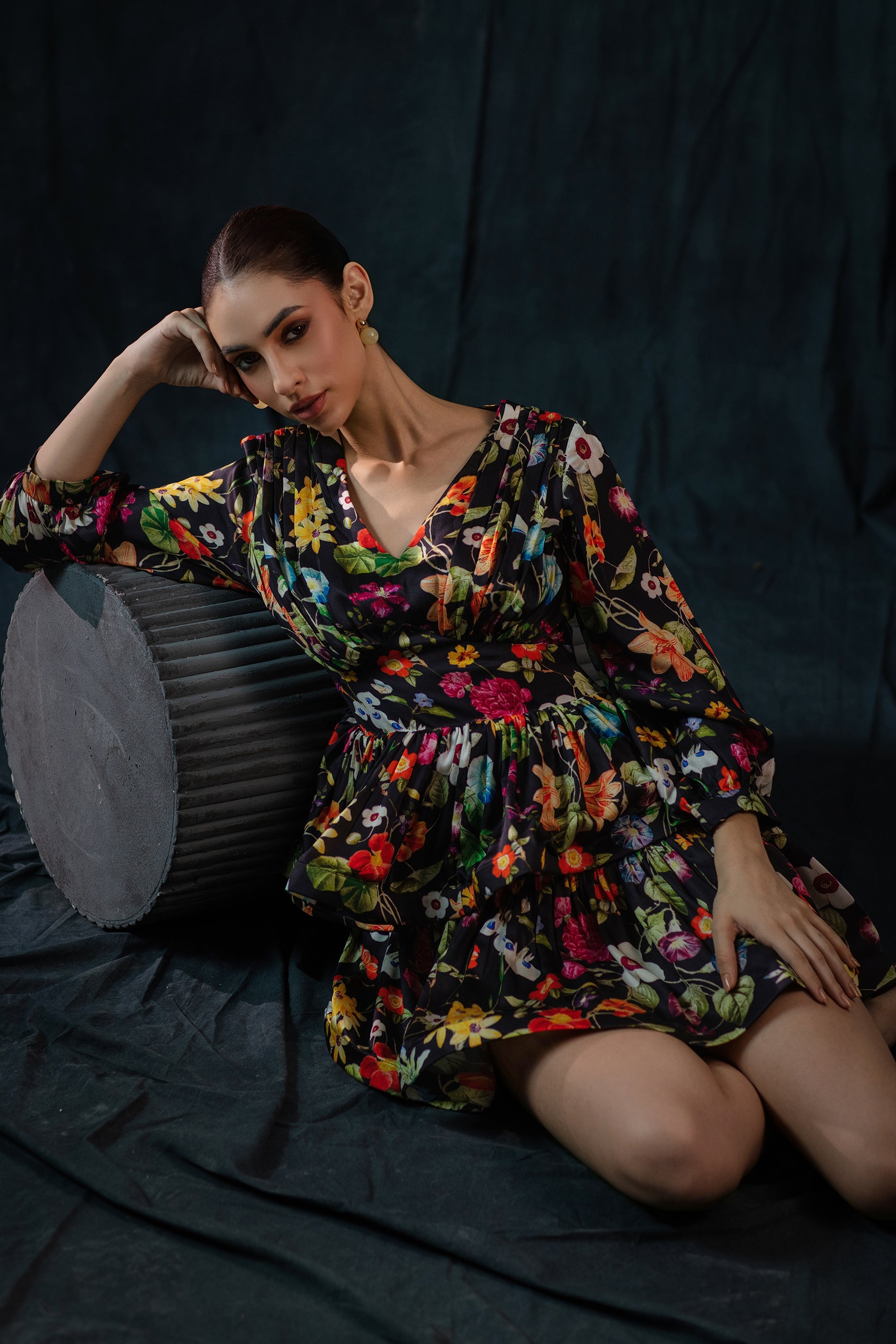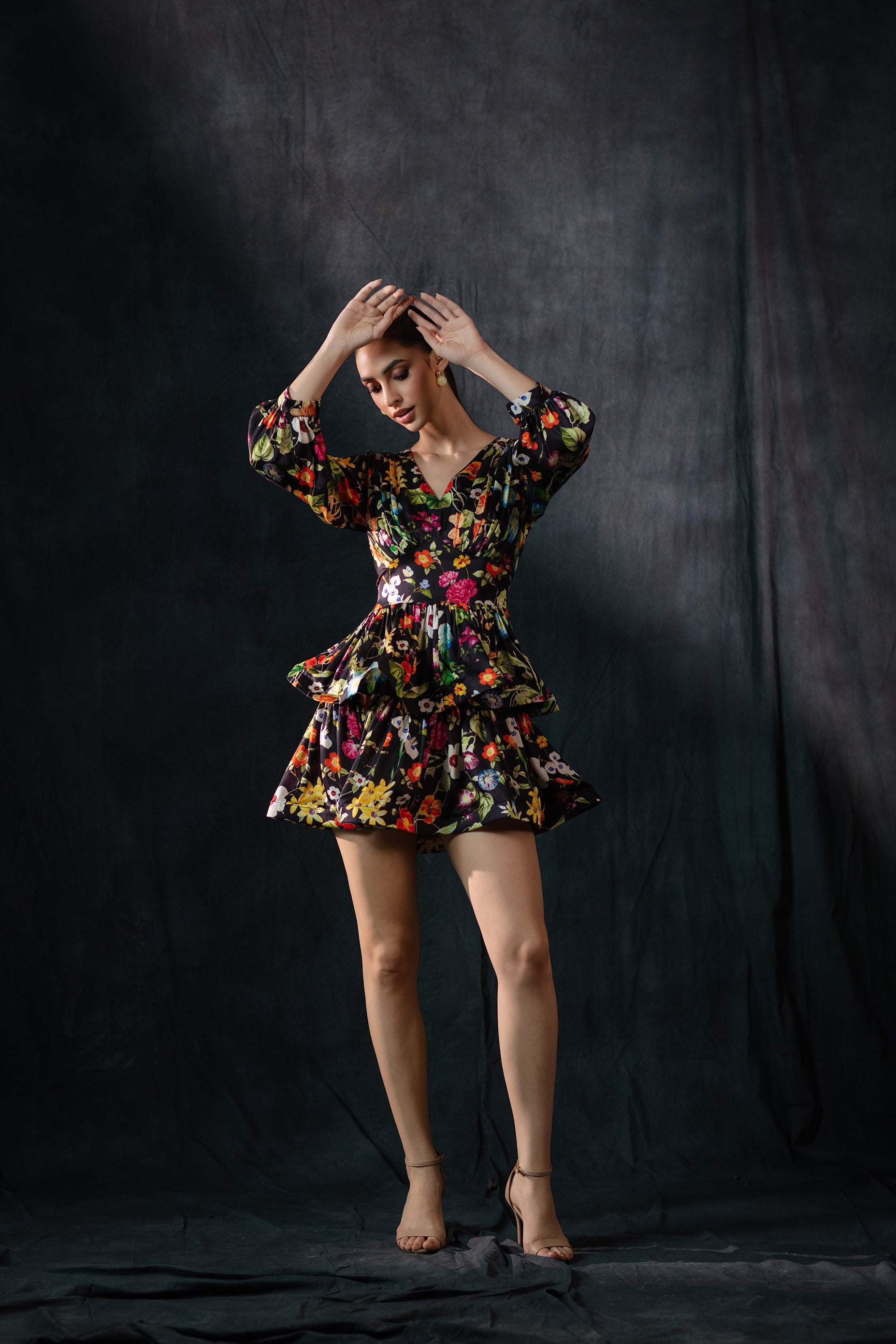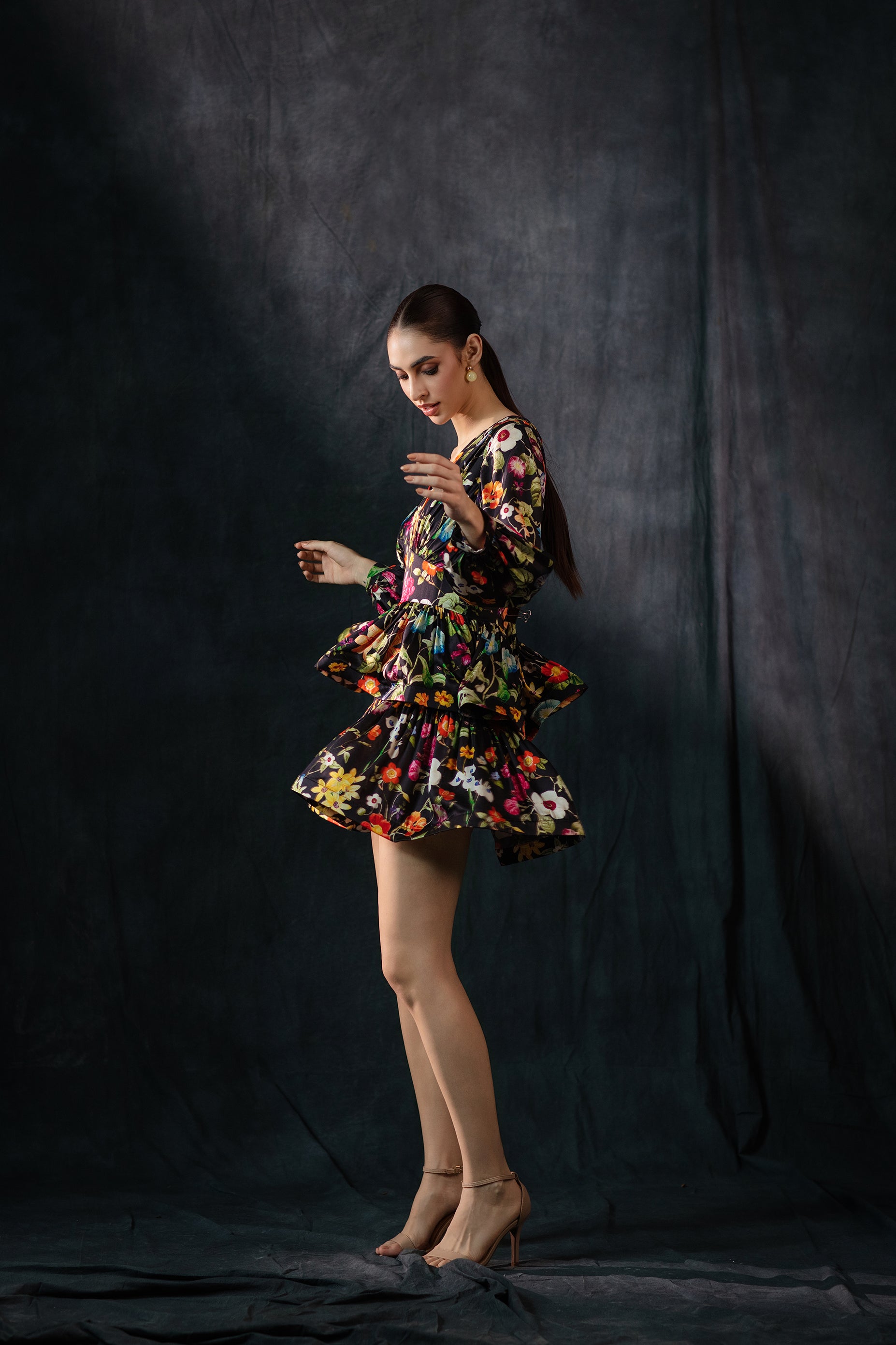 Effortlessly romantic with a touch of high-fashion flair the Midnight Bloom Tiered Mini Dress is a standout piece designed for the woman who loves movement and mood. Crafted in soft, fluid fabric and adorned with a rich floral print, it features a sculpted V-neckline, voluminous sleeves, and delicately tiered ruffles that sway with graceful ease.