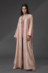 Moroccan Moss cape by Zeefaa is an ultimate beach cover-up. The cape has been designed with exquisite embroidery in the front lapels that feature the pastel peach floral embroidery with mirror work in the centre of the flowers. The embroidery has been inspired by the blooming flowers. The sheen of the fabric comes from the very fine Moroccan Moss fabric.