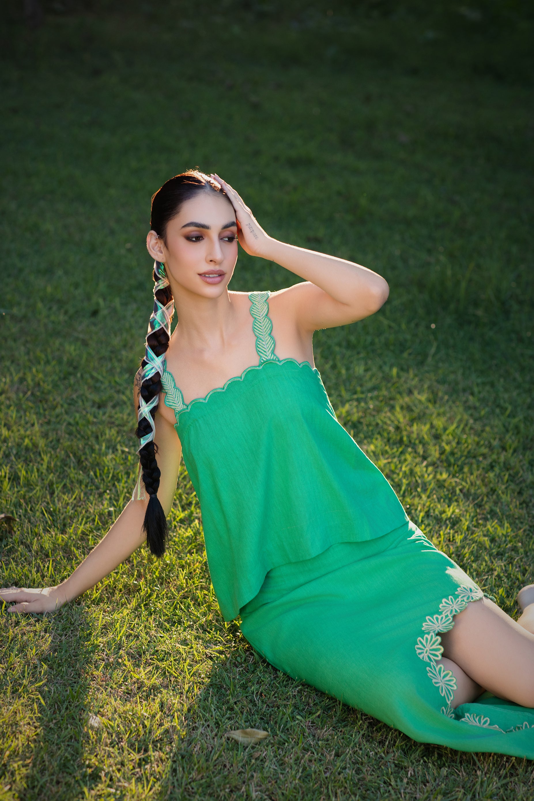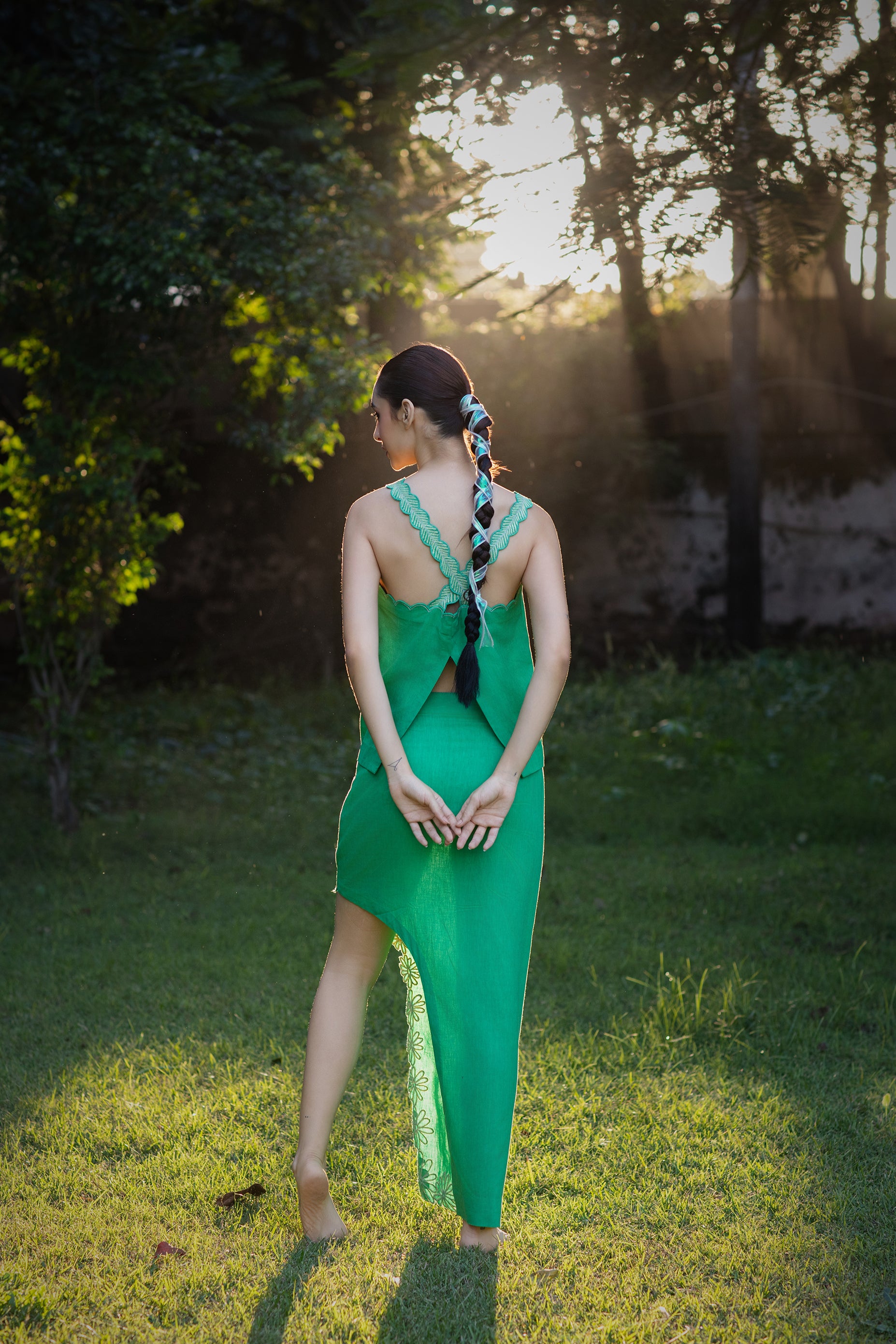 An asymmetric pure linen skirt with a softly angled hemline and a curved cut enhanced by tonal floral hand embroidery. The design brings fluidity, movement, and artisanal detail, while maintaining a minimal and elevated resort aesthetic.