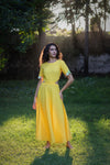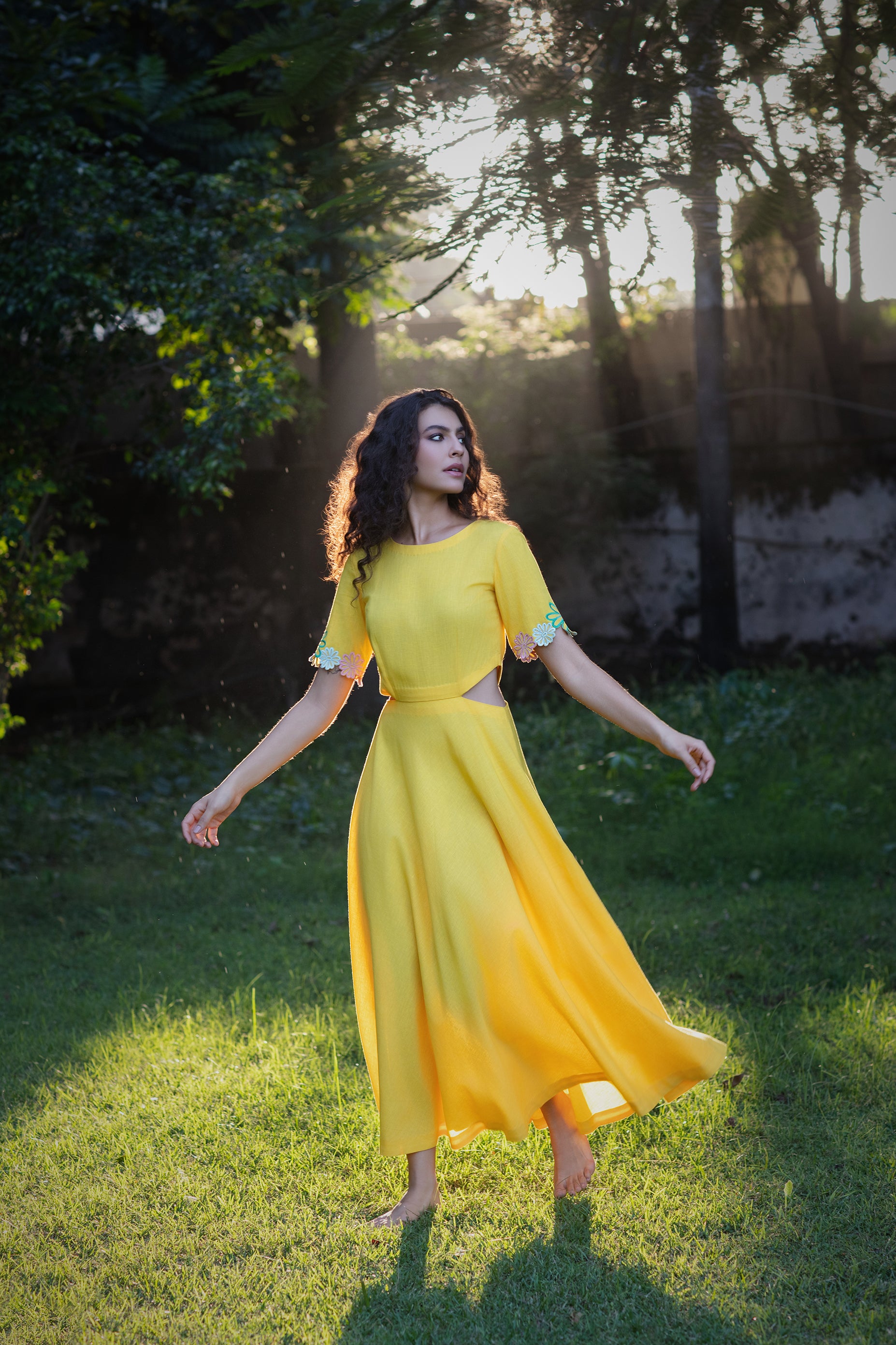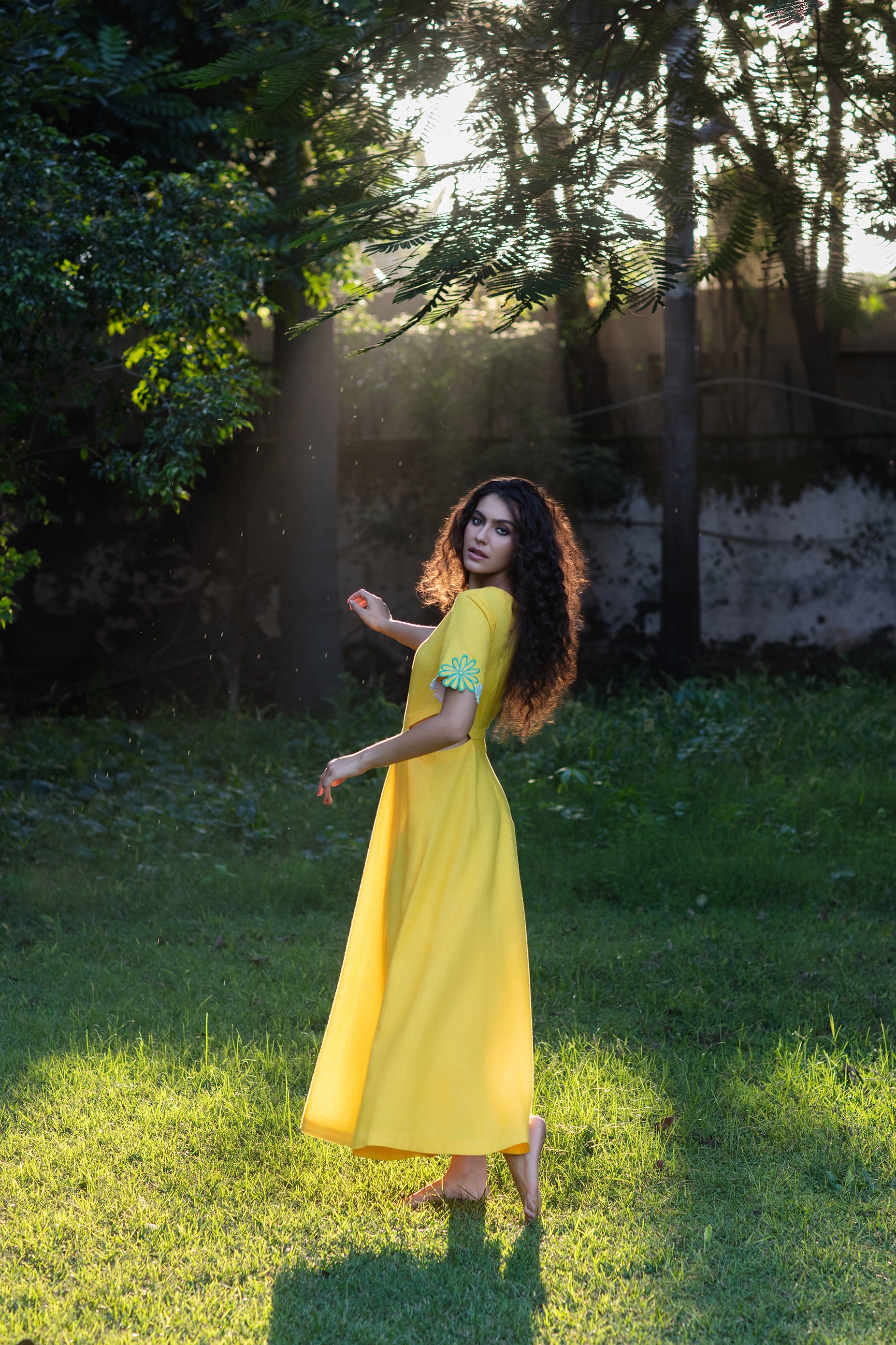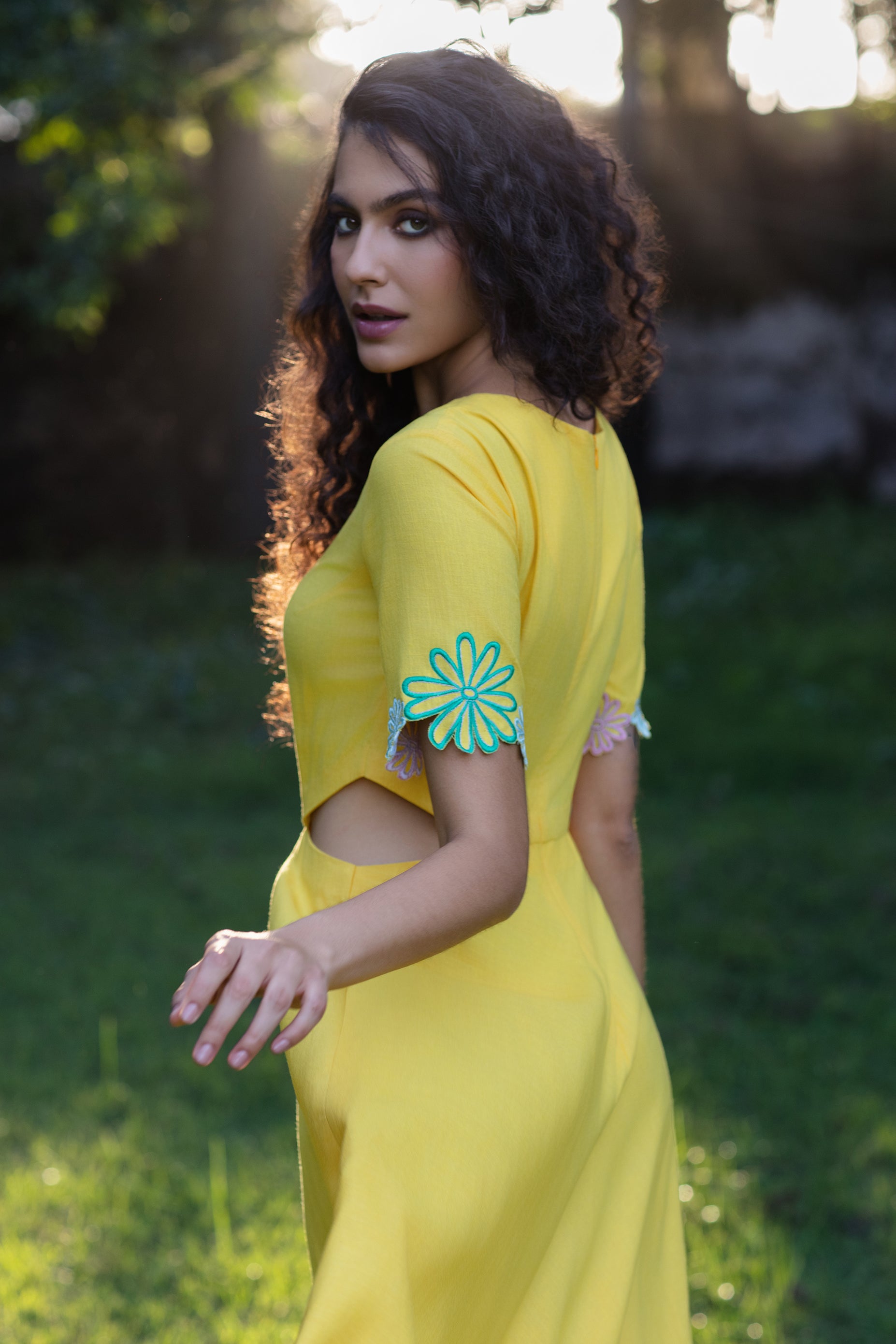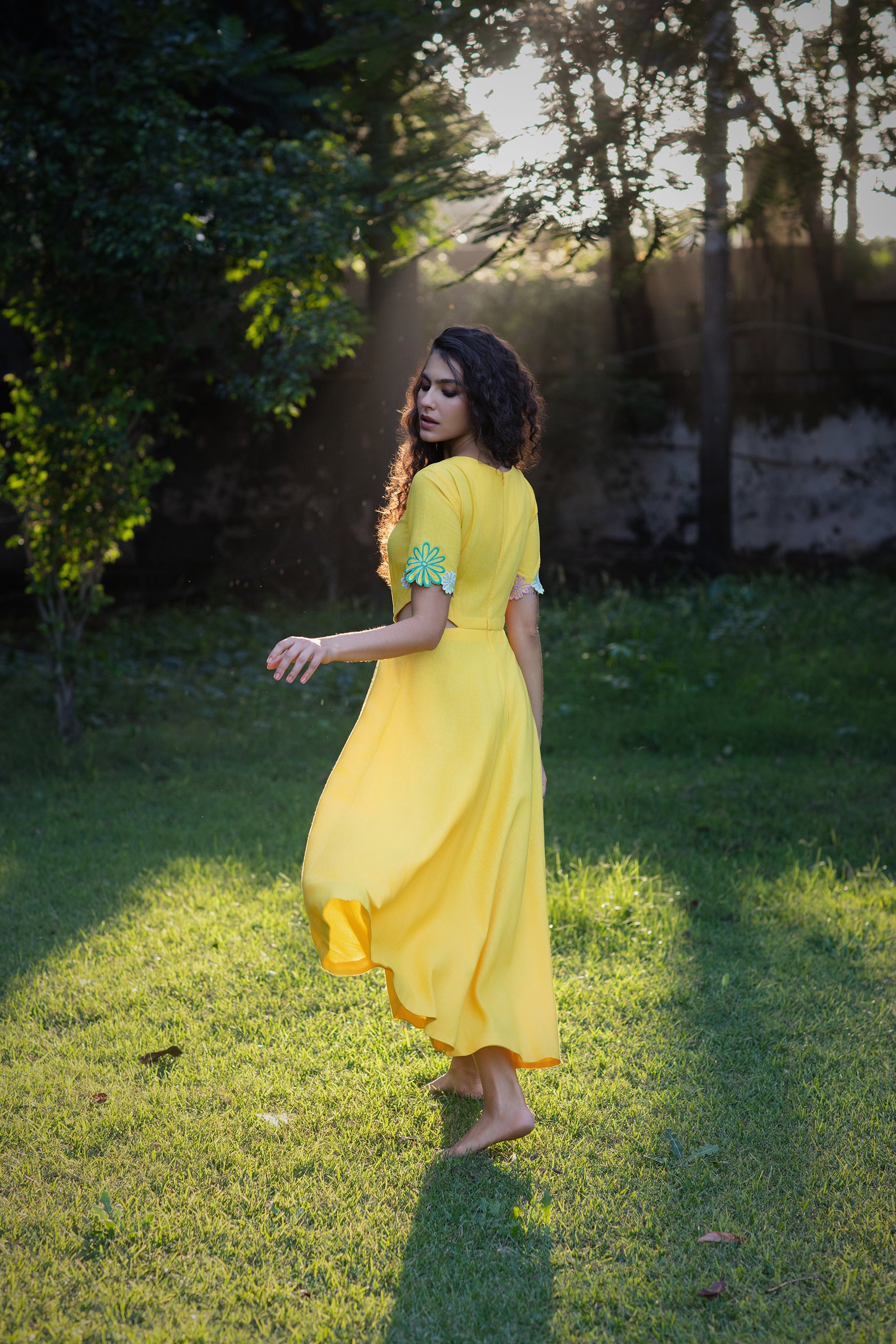The hand-embroidered daisy pattern on the sleeves introduces a subtle artisanal accent — fresh, minimal, and globally relevant. The soft flare and movement of the skirt bring natural elegance to every step, making it both elevated and easy to wear.