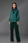 The Zurich silk shirt is made in an ultra-lightweight gleaming silk fabric. It is distinguished by its romantic statement ruffles across the high neck featuring Bold Lady like look. The conspicuous sleeves with structured cuffs complete the Lady like look. It’s silk crepe buttons add a delicate finishing touch. The flowy pants add fluidity to the outfit with every movement of yours.